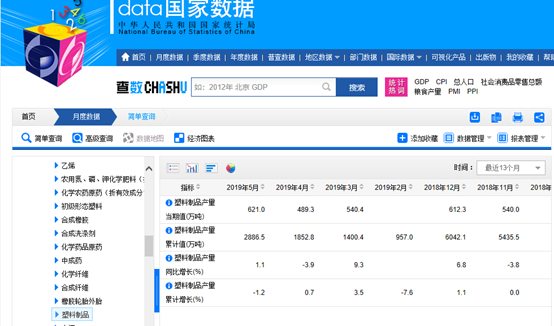 据国家统计局数据统计,2019年5月我国塑料制品产量为621万吨,环比增加26.9%,同比增加1.1%;1-5月份我国塑料制品总产量为2886.5万吨,同比下降1.2%。