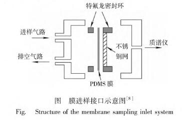 由于样品气体进样量小,气流的扰动状态以及VOCs分子的微分布情况都易对测定结果的真实性和平行性产生影响。鉴于此,进样系统的设计上主要考虑如何降低VOCs的丢失,如何稳定气流。为了达到此目的,需要创造相对稳定的进样区域并起到选择性作用,因此进样系统一般采用了膜进样技术,即使用二甲基硅氧烷树脂(PDMS)滤膜进样,其示意图见下图。