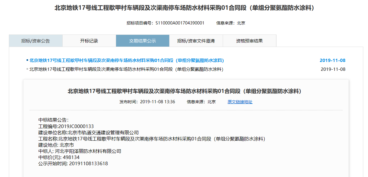 慧正资讯:近日,全国公共资源交易平台发布北京地铁17号线工程歇甲村车辆段及次渠南停车场防水材料采购01合同段(单组分聚氨酯防水涂料)的中标结果。结果显示,宇阳泽丽以第一名中标候选人成功中标该项目。