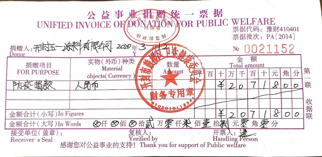 这次活动共筹得善款20718元,并于2020年3月12日上交至开封市鼓楼区卫生健康委员会。同时,公司还将为奉献爱心的残疾员工、健全员工设立功德榜,以弘扬团结互助、齐心协力的主人翁精神。