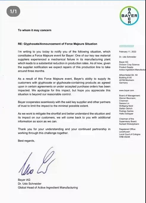 由于该不可抗力事件,拜耳通告他们的草甘膦或含草甘膦产品的某些订单的如期交付可能受到影响。