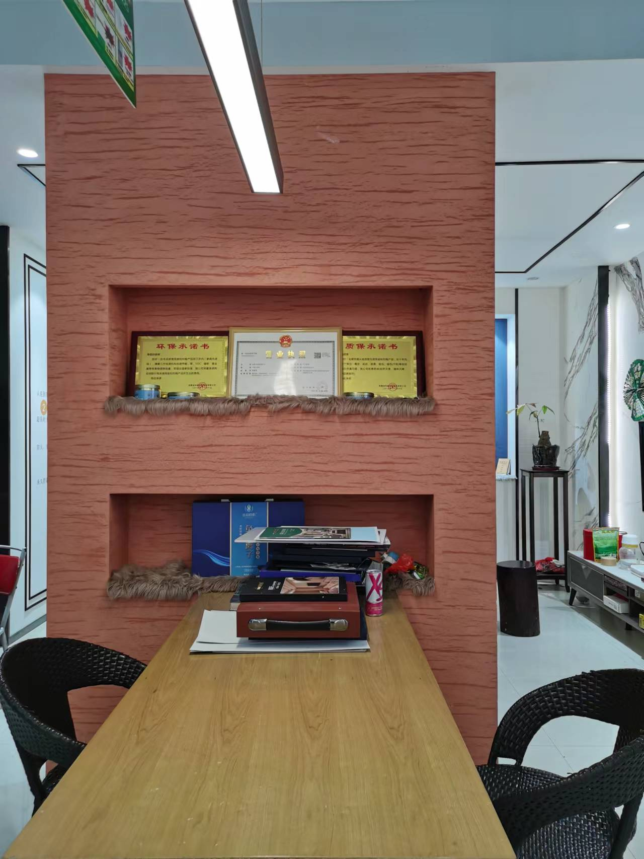 耒阳民风淳朴、物阜人丰,从耒阳人的方言能独立于衡阳、郴州、永州等周边地域,说明耒阳人有独特的个性。咱们的王总就是这样特立独行的一位建材老师傅。走进门店,整个店面布置简约通透,光线明亮。往里走两步,目光就被茶厅角落挂着“匠心环保,绿色品质”的锦旗所吸引,它像一个忠诚的卫士,时刻提醒着王总用匠心品质、绿色环保的产品带给客户完美的家居装饰!最后转身聚焦洽谈区,映入眼帘的环保承诺书、质保承诺书,也如同两位哨兵,坚定不移的屹立在那里,风吹不动,雷打不动!王总说:对于产品的质量,咱绝不含糊!