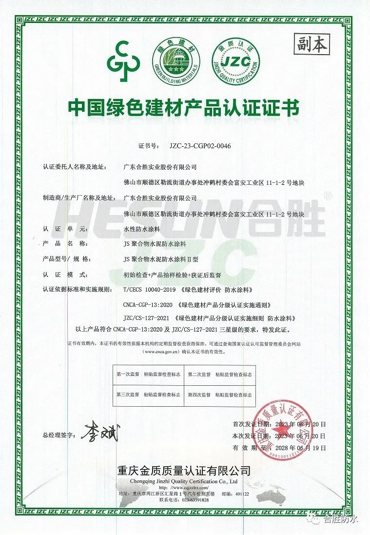 评审过程严格采用“初始检查+产品抽样检验+获证后监督”的专业化认证模式。经审核,合胜防水认证产品符合“T/CECS 10040-2019《绿色建材评价 防水涂料》、CNCA-CGP-13:2020《绿色建材产品分级认证实施通则》、JZC/CS-127-2021《绿色建材产品分级认证实施细则 防水涂料》”的认证依据标准和实施规则,正式通过了中国绿色建材产品评价体系最高级的三星级认证!