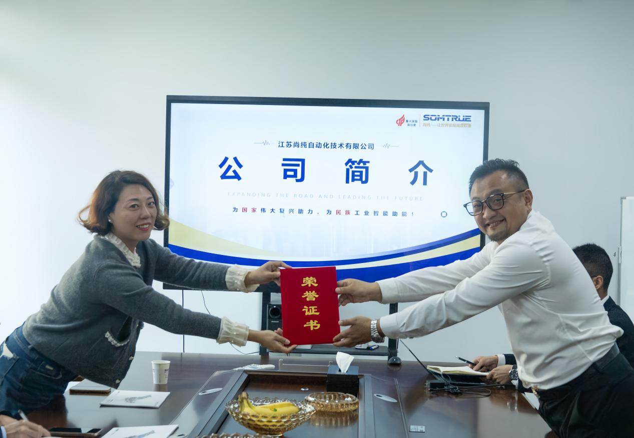 随后,双方移步至会议室,正式会议随即展开。在正式会议中,协会向尚纯智造颁发了理事单位证书,标志着尚纯智造正式成为协会大家庭的一员。杜董事长对此深感荣幸,他承诺将与协会各成员单位紧密合作,借助协会的平台优势,共同推动涂料行业的智能化发展。