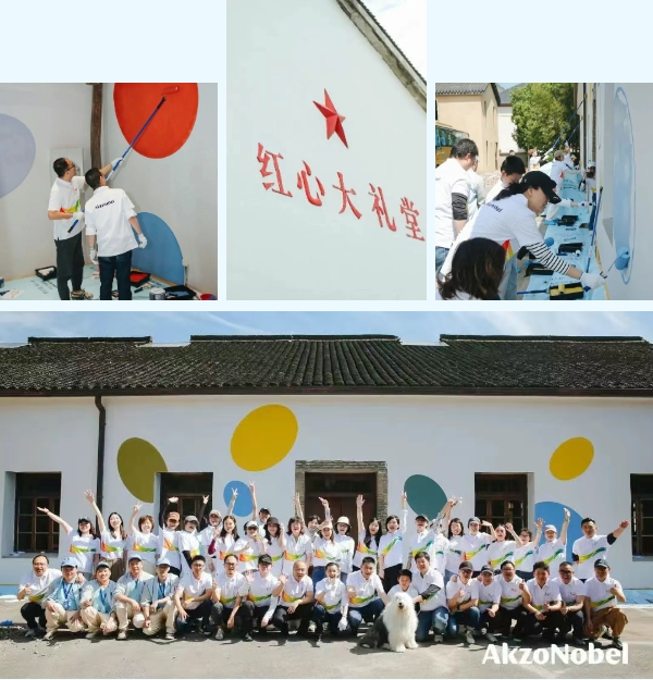 刚刚过去的周六,近50名阿克苏诺贝尔员工志愿者与合作伙伴来到青山村,经过专业涂刷指导后,拿起滚筒、亲身参与并见证着红心大礼堂的斑斓蜕变。