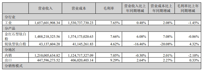 2024年,惠云钛业钛白粉业务表现稳健,钛白粉销售额达15.31亿元,全年产量12.04万吨,同比增长22.17%,销量11.13万吨,同比增长10%。其中,金红石型钛白粉产量11.62万吨,销量10.79万吨,占主导地位;锐钛型钛白粉产量与销量分别为0.42万吨和0.34万吨。