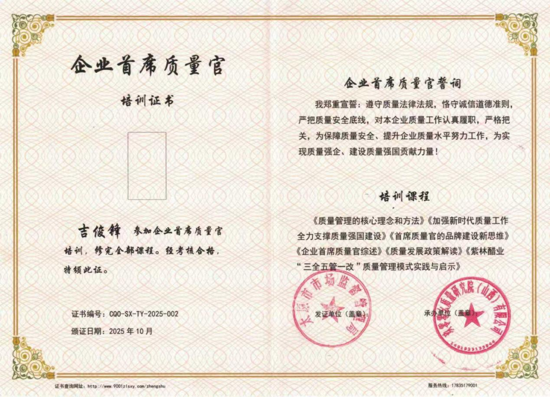 华豹公司质量检验部部长吉俊锋顺利通过由太原市监督管理局主办的“企业首席质量官”培训考核,荣获权威认证,为企业高质量发展再添核心动能。