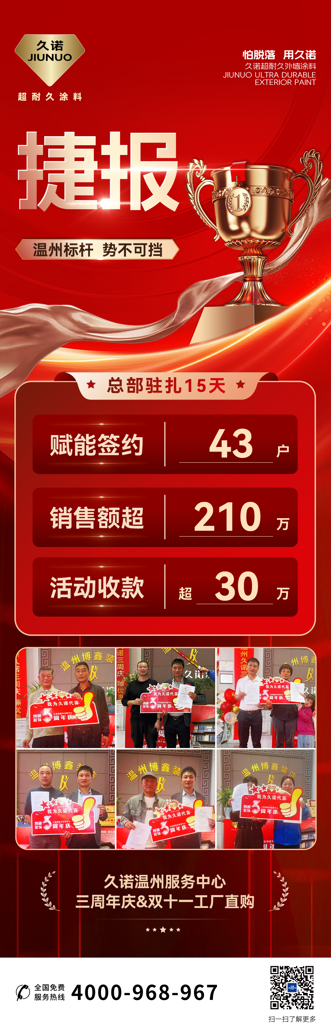 在建材行业,衡量一个品牌实力的真正标尺,并非单一节点的爆发,而是其能否系统化地助力经销商实现持续盈利与跨越式增长。久诺品牌与温州经销商的合作历程提供了经典范本:从2022年“开业即盈利”,到2025年三周年庆期间创下签约43户、销售额突破210万的区域新纪录,这一路的辉煌战绩,共同印证了久诺“全周期赋能体系”的强大生命力与卓越成效。