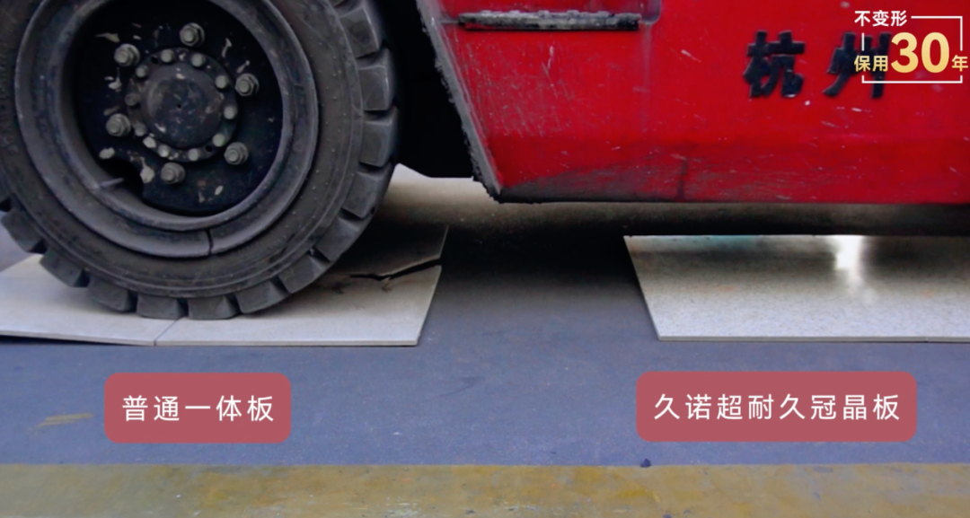 ▲叉车压力测试:久诺冠晶板无裂痕,普通一体板一压即碎