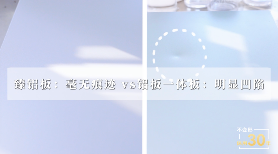 ▲重物砸落测试:久诺臻铝板光滑无痕,普通铝板一体板明显凹陷