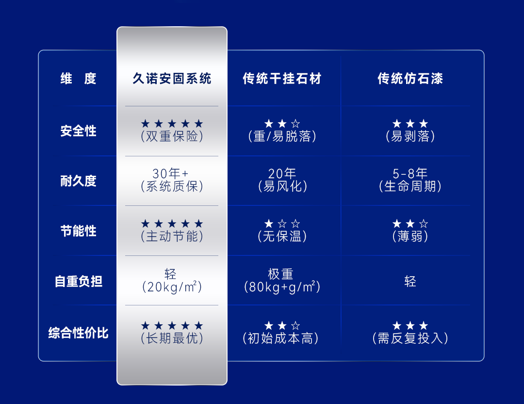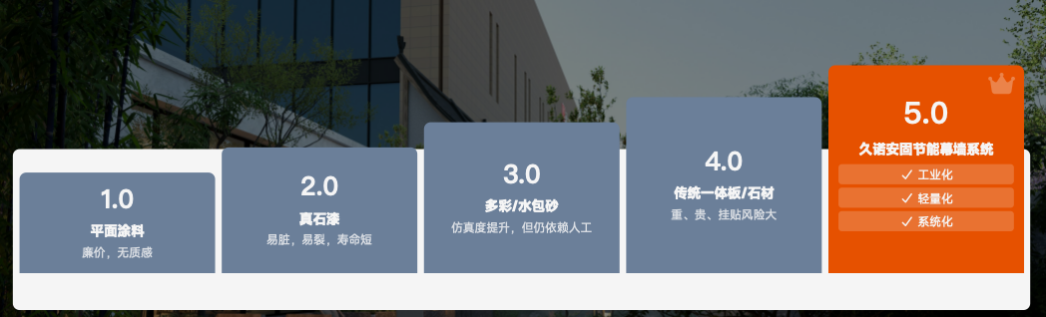 在此背景下,久诺正式发布其创新研发的“超耐久安固幕墙系统”,这标志着外墙行业从“手工作坊式”生产正式迈向“工业化、系统化、轻量化”的5.0新阶段。