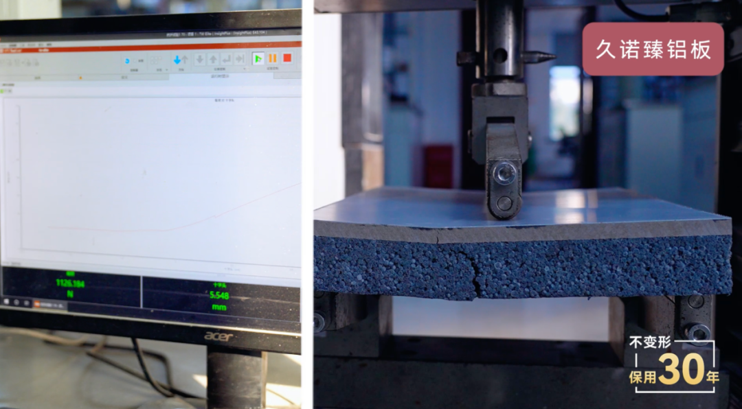 ▲极限抗折测试:臻铝板保温&基板断裂,饰面层有折痕但不断裂脱落