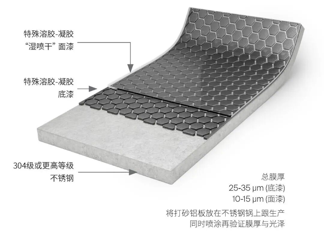 其中,新PPG FUSION® Edge是一款专为不锈钢“蜂窝”不粘纹理而研发的高性能溶胶-凝胶“陶瓷”不粘涂层。配方不含PFAS, 为炊具提供坚硬且耐用的不粘表面,能承受高温和日常磨损。 按照PPG推荐的喷涂工艺,在304级或更高等级的不锈钢表面进行涂覆,并在抛光底漆后涂覆一层透明连续的保护膜,PPG将出具食品接触合规性文件。