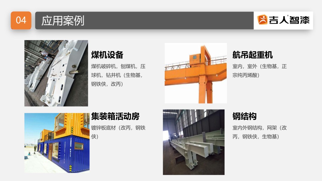 建筑与钢结构:集装箱活动房(镀锌板底材)、室内外钢结构、网架等,兼顾防护与美观。
