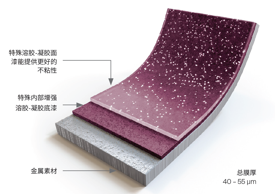 新型的PPG FUSION® Pro II是溶胶凝胶“陶瓷”不粘涂层的又一突破。Fusion Pro II为溶胶-凝胶“陶瓷”不粘涂层升级了新的标准,提供更为持久的不粘性能,且配方不含PFAS*。