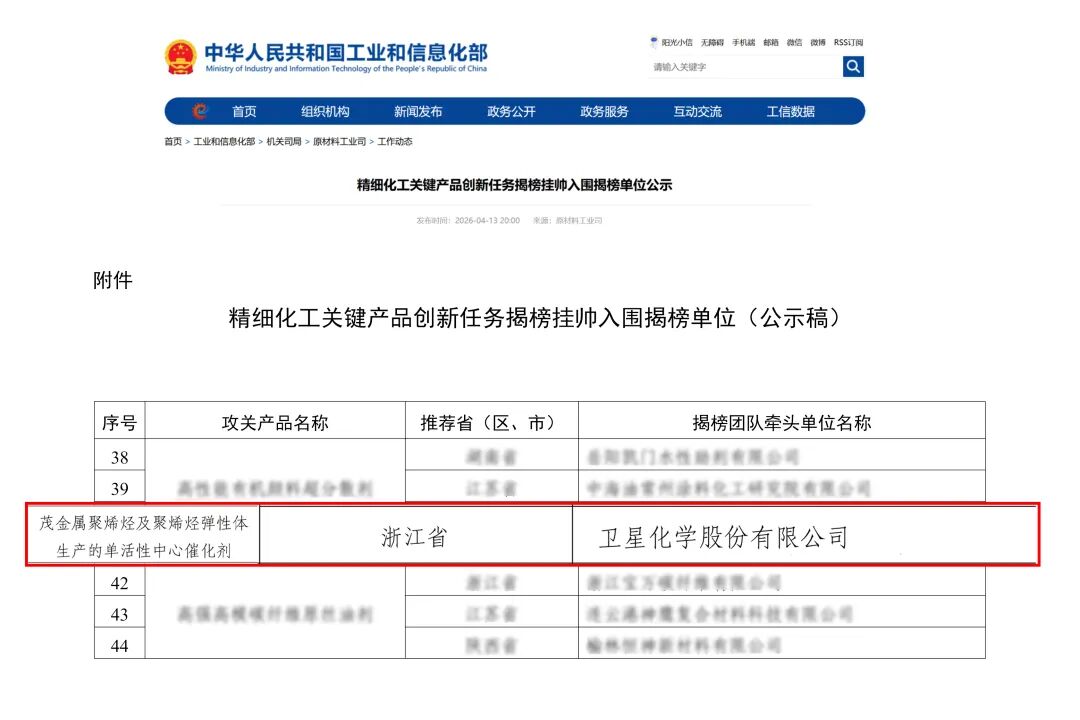 慧正资讯,近日,由卫星化学股份有限公司牵头申报的“茂金属聚烯烃及聚烯烃弹性体生产的单活性中心催化剂”项目,成功入选工业和信息化部“精细化工关键产品创新任务揭榜挂帅”名单,在服务国家战略需求、承担国家级科技攻关任务上再次迈出关键一步。
