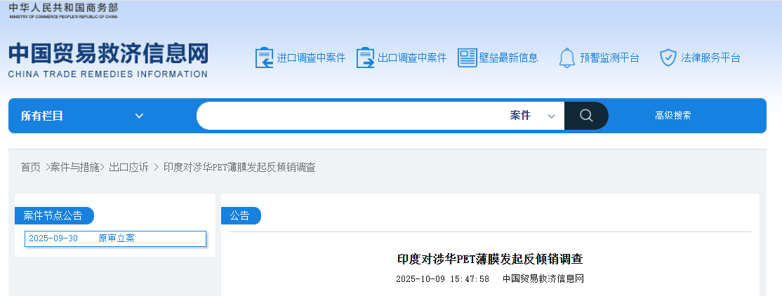 印度对原产于或进口自中国、孟加拉国、泰国和美国的PET薄膜[Polyethylene Terephthalate Film (PET Films)]发起反倾销调查。