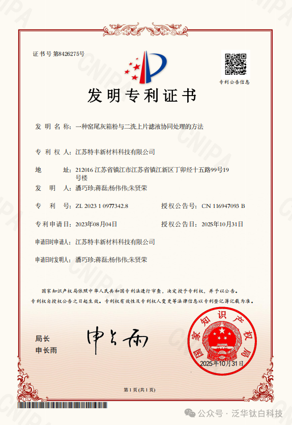 泛华化学旗下子公司江苏特丰新材料科技有限公司(以下简称“特丰新材”)提交的“一种窑尾灰箱粉与二洗上片滤液协同处理的方法”正式获得国家知识产权局颁发的发明专利证书