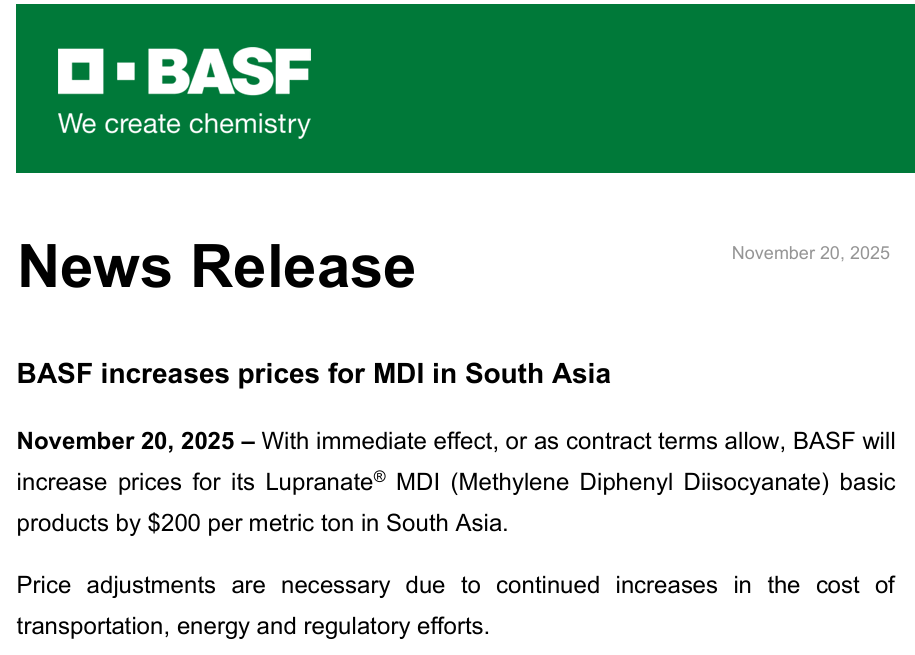巴斯夫宣布南亚地区MDI产品价格上涨