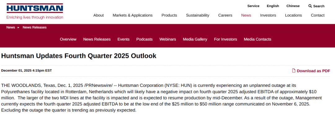 2025年12月1日,亨斯迈官网发布消息称,由于公司位于荷兰鹿特丹的聚氨酯工厂目前正经历一次计划外停车,预计将对2025年第四季度调整后EBITDA造成约1000万美元的负面影响。
