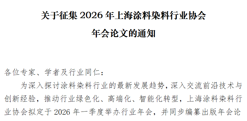 为深入探讨涂料染料行业的最新发展趋势,深入交流前沿技术与创新经验,推动行业绿色化、高端化、智能化转型,上海涂料染料行业协会拟定于2026年一季度举办行业年会,并同步编纂出版年会论文集。