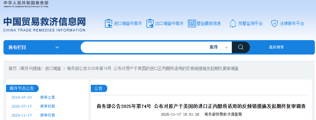 商务部:对原产于美国的进口正丙醇继续征收反倾销税