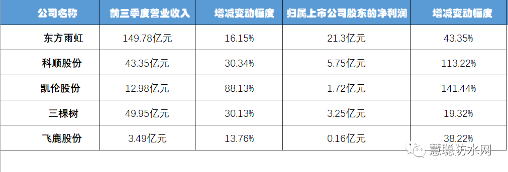 近日,北京东方雨虹防水技术股份有限公司、科顺防水科技股份有限公司)、三棵树涂料股份有限公司、江苏凯伦建材股份有限公司、、株洲飞鹿高新材料技术股份有限公司相继发布2020年第三季度报告。