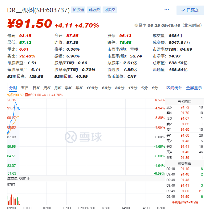 6月29日,三棵树迎来除权日,股票开盘跳涨,09:42股价创历史新高,现价92.15元,涨幅5.45%。