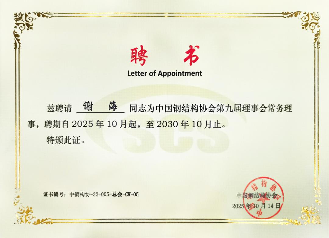近日,江苏冠军科技集团股份有限公司董事长谢海先生被正式受聘为中国钢结构协会第九届理事会常务理事。