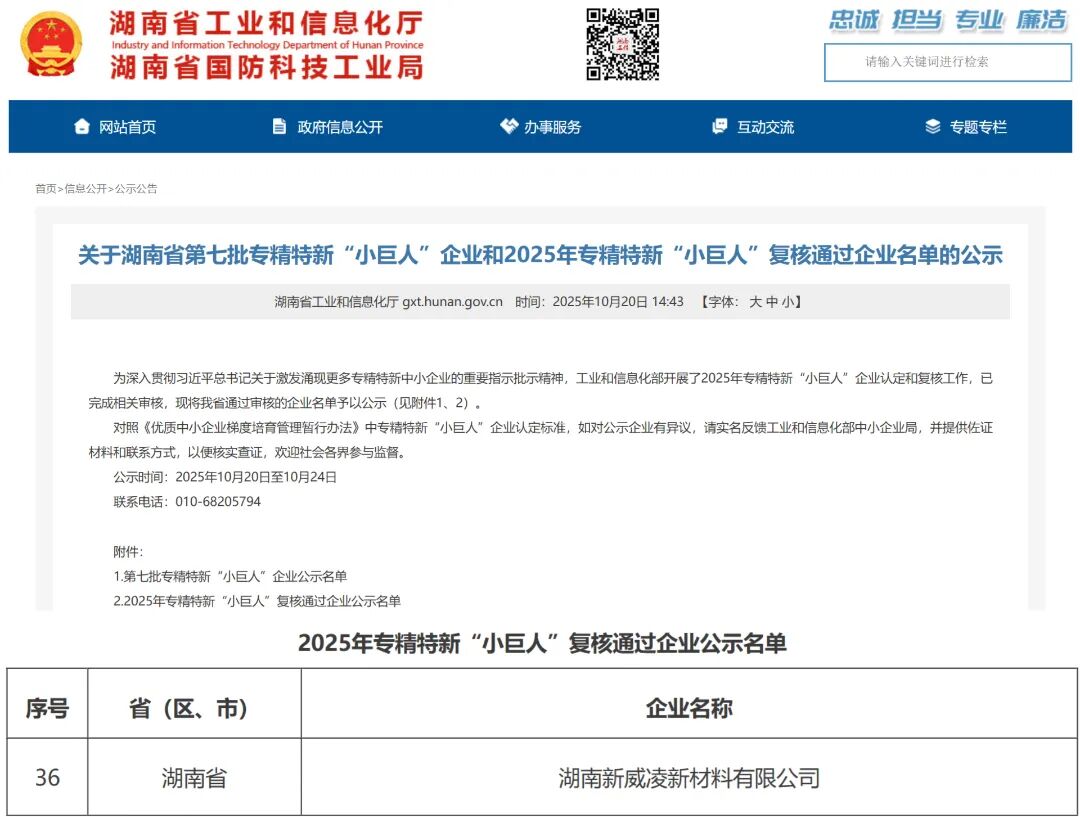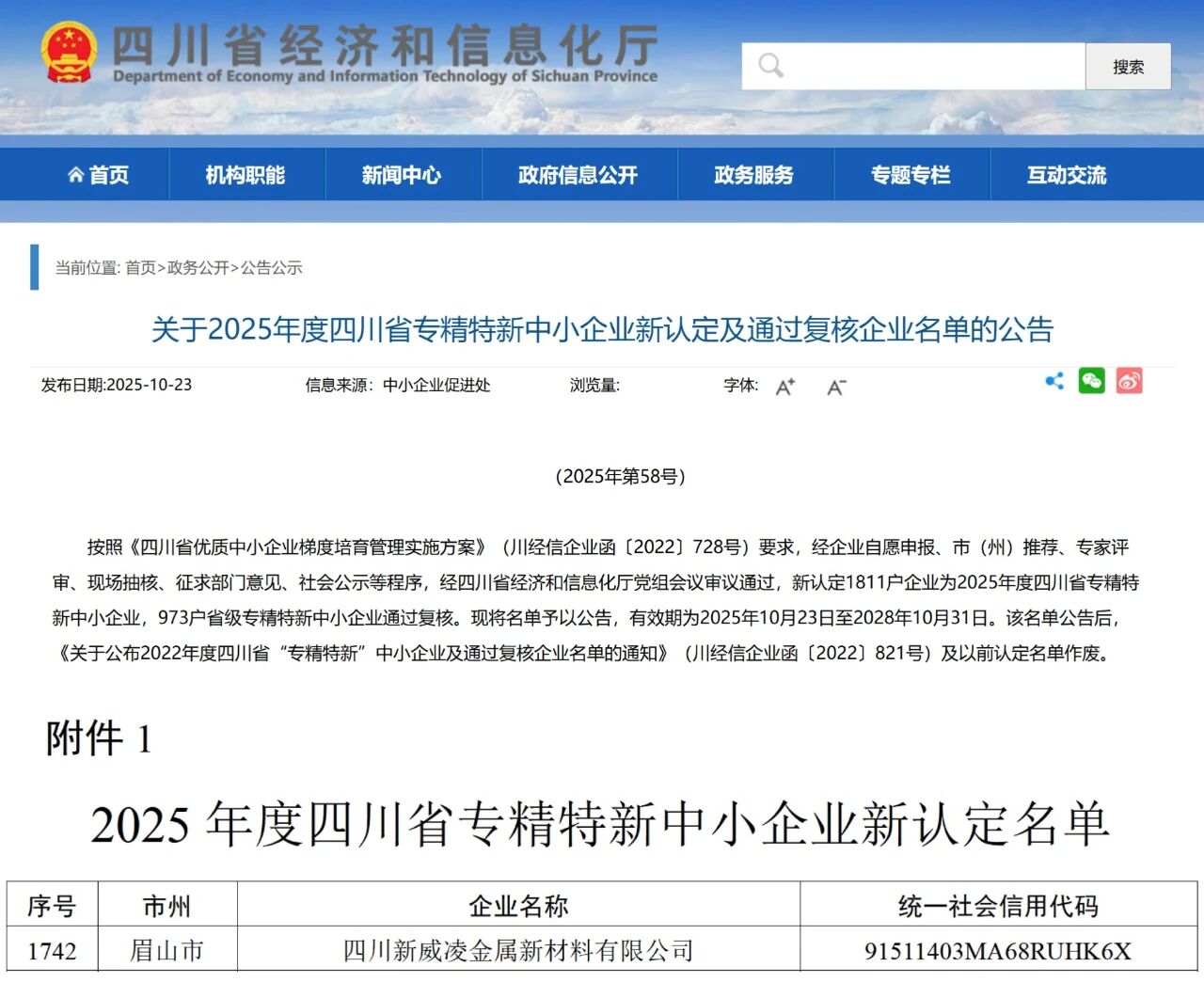 四川新威凌本次被认定为四川省专精特新中小企业,既是对新威凌公司长期专注细分领域、坚持自主创新发展的肯定,也为企业持续深耕新材料产业注入了新动力。