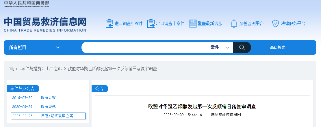 欧盟对华聚乙烯醇发起第一次反倾销日落复审调查