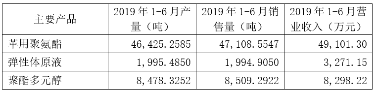 弹性体原液2019年1-6月产量1,995.4850吨,2019年1-6月销售量1,994.9050吨,2019年1-6月营业收入3,271.15万元。