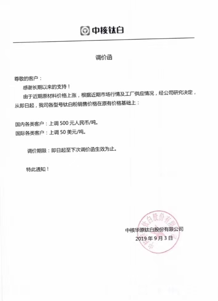 慧正资讯:盘点钛白粉企业的调价函!