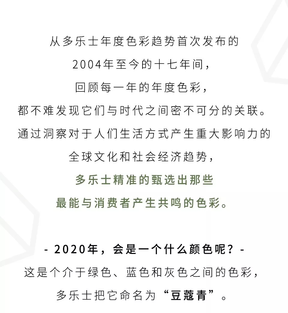 宛若初生的豆蔻青,象征着蓬勃生命和崭新的开始,完美诠释了2020年度主题“从心出发”。它具有平和纯净的特质,是一种介于绿色、灰色和蓝色之间的具有流动感的微妙色彩。在不同的色彩搭配中,所呈现的效果也随之变化,呈现丰富多彩的光影美感。