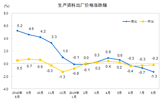 慧正资讯:2019年8月份,全国工业生产者出厂价格同比下降0.8%,环比下降0.1%;工业生产者购进价格同比下降1.3%,环比下降0.2%。1—8月平均,工业生产者出厂价格比去年同期上涨0.1%,工业生产者购进价格下降0.2%。