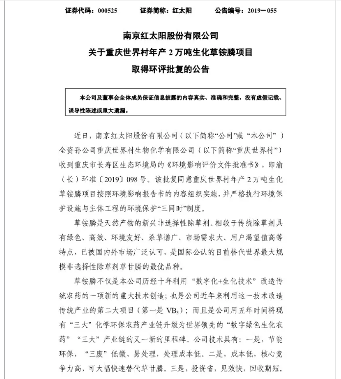 慧正资讯:红太阳(000525)9月15日晚间公告,公司全资孙公司重庆世界村收到重庆市长寿区生态环境局的《环境影响评价文件批准书》,同意重庆世界村年产2万吨生化草铵膦项目按照环境影响报告书的内容组织实施。至此,该项目已取得全部国家合法建设手续,计划首套装置争取在2020年6月1日前建成投产。
