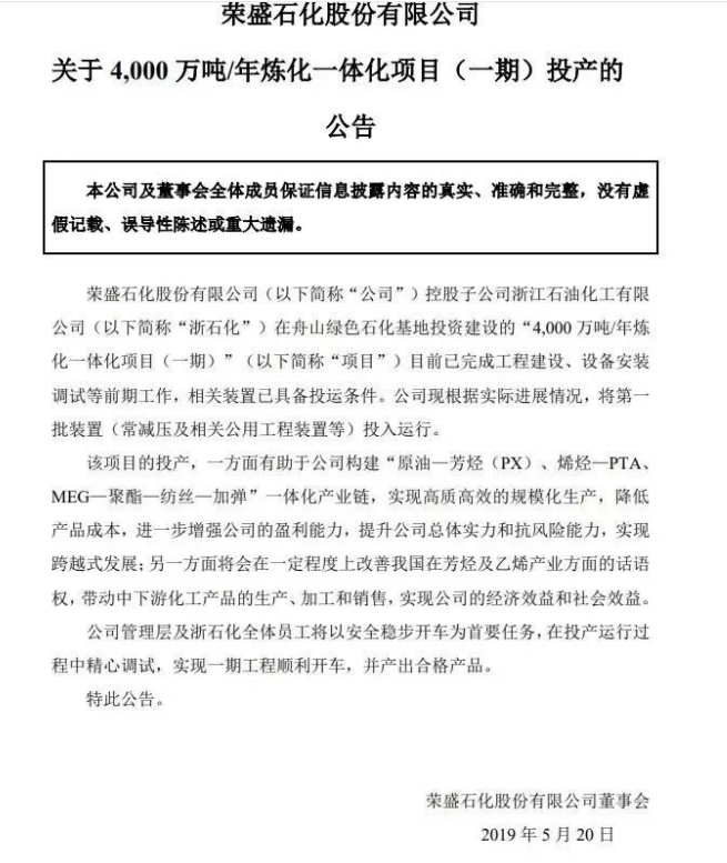2019年5月20日晚,项目建设方荣盛石化和桐昆股份双双宣布:备受业界瞩目的浙江石油化工有限公司(以下简称“浙江石化”)4000万吨/年炼化一体化项目一期工程,在经过近两年建设后终于投产。