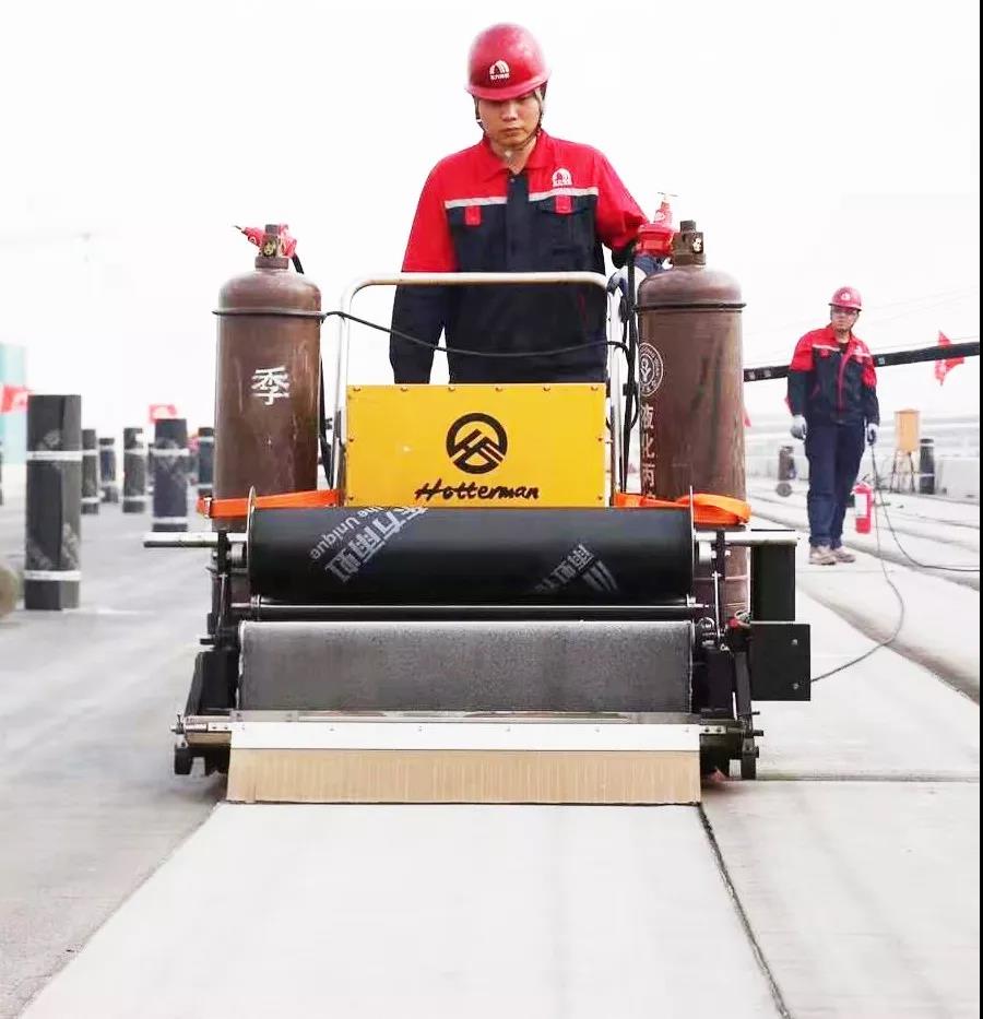 为了实现绿色机场、智慧机场,在本项目中,东方雨虹选用“虹人(Hotterman)”智能型热熔防水卷材摊铺机车坦途(ZANDRA)助阵,它集控制、行走、轨迹校正、卷材及地面加热、压实摊铺于一体。