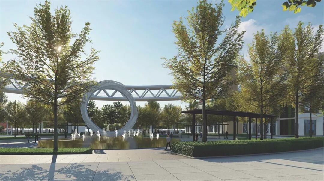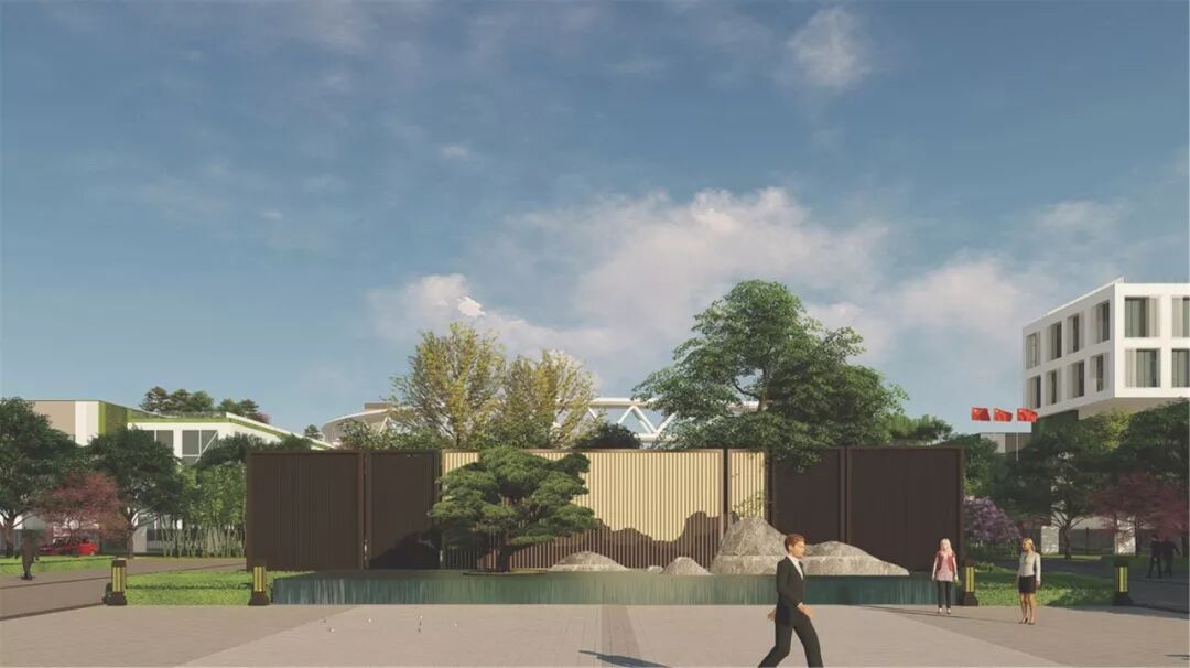 清晨,早班工人经过入口广场,看见阳光洒在镜面水池上,穿过景观墙到达园区内,通过轴线可以方便地到达各个厂房,开始一天的工作。
