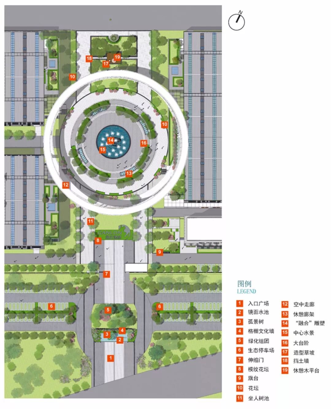 产业园的园区总体布局为“一轴两带四核”。一轴是产业园中轴线,也是主要景观带,将四核串联起来。四核依照“起承转合”的原则布置,入口前广场用景墙来营造园区的神秘感;形象广场用横纹花坛展示企业形象;在展示互动空间形成高潮,下沉式广场加强了场所的内向性,用雕塑点明产业园的“融合”主题;在轴线终端创造休闲平台,用堆坡将景观延续。园区内还置入了小园林,提供休憩空间。漫步园区,可以感受不同的景致。