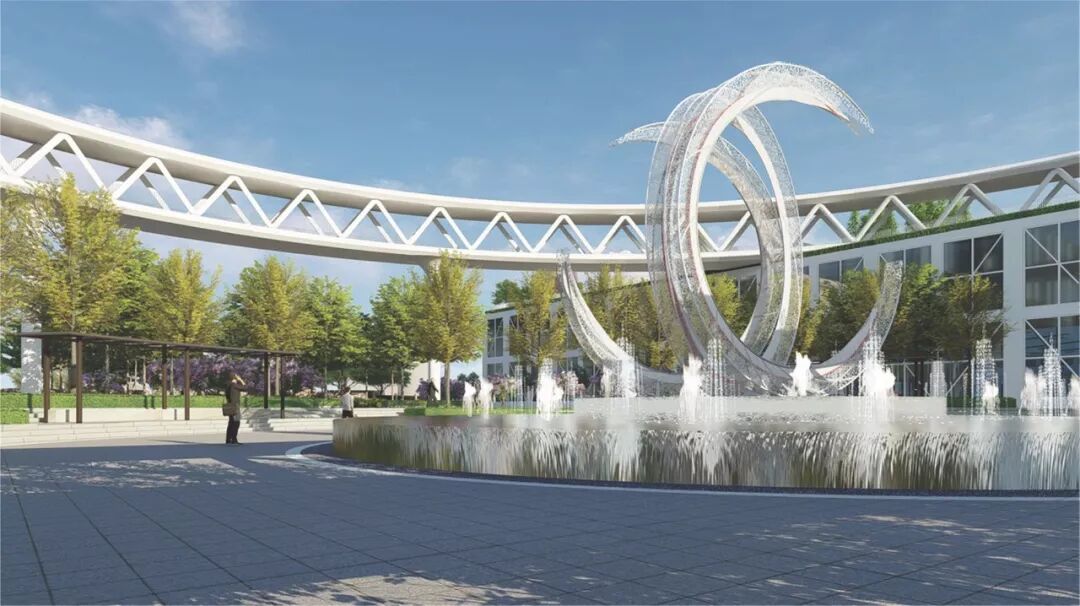 人文鼎盛的七都有着深厚的国学底蕴,设计师从中汲取营养。国学是中国传统思想文化学术,国学可以发展到今天的高度,离不开各家学说的“融合”,“融合”也是国学的重要内核。多年来,凯伦股份一直将“精细融合”作为企业标语,设计师将“融合”作为设计理念,是在哲学层面进行的设计探索。而环廊作为整个园区的核心,统筹着园区的布局、交通、景观,则是设计理念“融合”的建筑化表现。