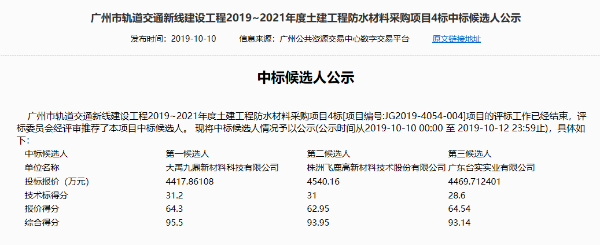 慧正资讯:10月10日,广州公共资源交易中心公布“广州市轨道交通新线建设工程2019~2021年度土建工程防水材料采购项目”的中标候选人结果。