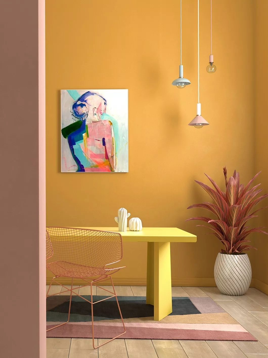大面积使用其实非常的大胆,墙色的使用是最常见的,可以带来温暖的气息。若真想在墙壁上使用这个颜色,可尝试采用分色、拼接的形式,会更有创意。