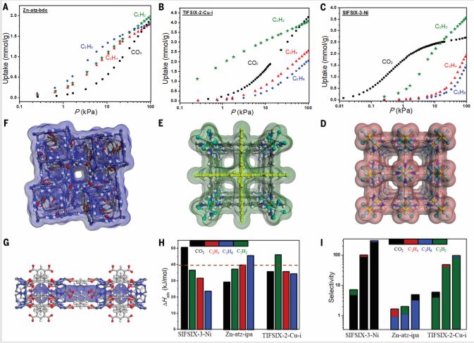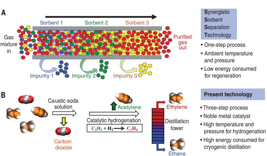乙烯的高纯制备在初级化工原料生产中有着举足轻重的作用,传统的乙烯分离方法步骤繁琐、能耗较高。乙烯与乙炔、乙烷、二氧化碳等气体的物化特性十分相似,提纯过程需要三步工艺——需使用碱性池分离二氧化碳;用贵金属催化剂在高温高压条件下将乙炔转化成乙烯或乙烷;而乙烯和乙烷两种气体的纯化分离仍依赖于分步蒸馏工艺,即利用不同组份的沸点不同,控制其分步流出分离塔并收集。这样的分离工艺步骤繁多、成本较高且能耗高。如何用更加节能高效的方式,实现乙烯的分离和纯化呢?