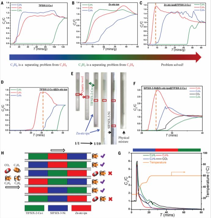 如果使用一种材料无法一步将乙烯从四种气体中过滤出来,那么能否使用对特定气体有最强吸附力的三种材料,分别来捕获掉乙炔、乙烷、二氧化碳?只要乙烯在这三种材料中都不被吸附,那么乙烯就会最先从吸附柱末端流出富集。