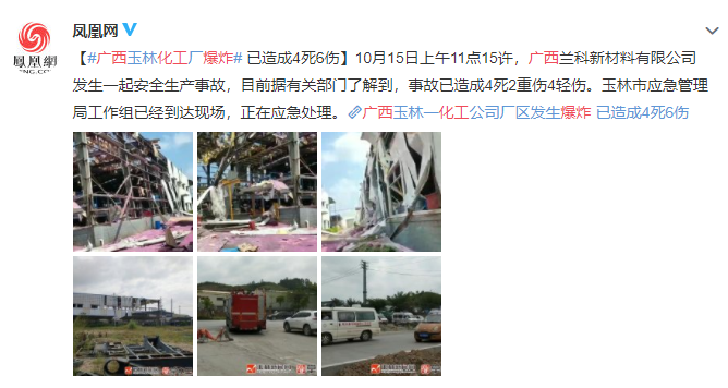 慧正资讯:2019年10月15日上午11点15许,位于陆川县北部工业园集中区东段3号,广西兰科新材料有限公司突发爆炸。事故已造成4死2重伤4轻伤。事故发生后,当地应急、消防等相关部门已赶去现场处理。经查,事故发生为该公司的树脂合成反应车间内的反应釜发生爆炸,未起火。反应釜内主要有甲醛、苯酚和三醛树脂,储量约5吨左右。