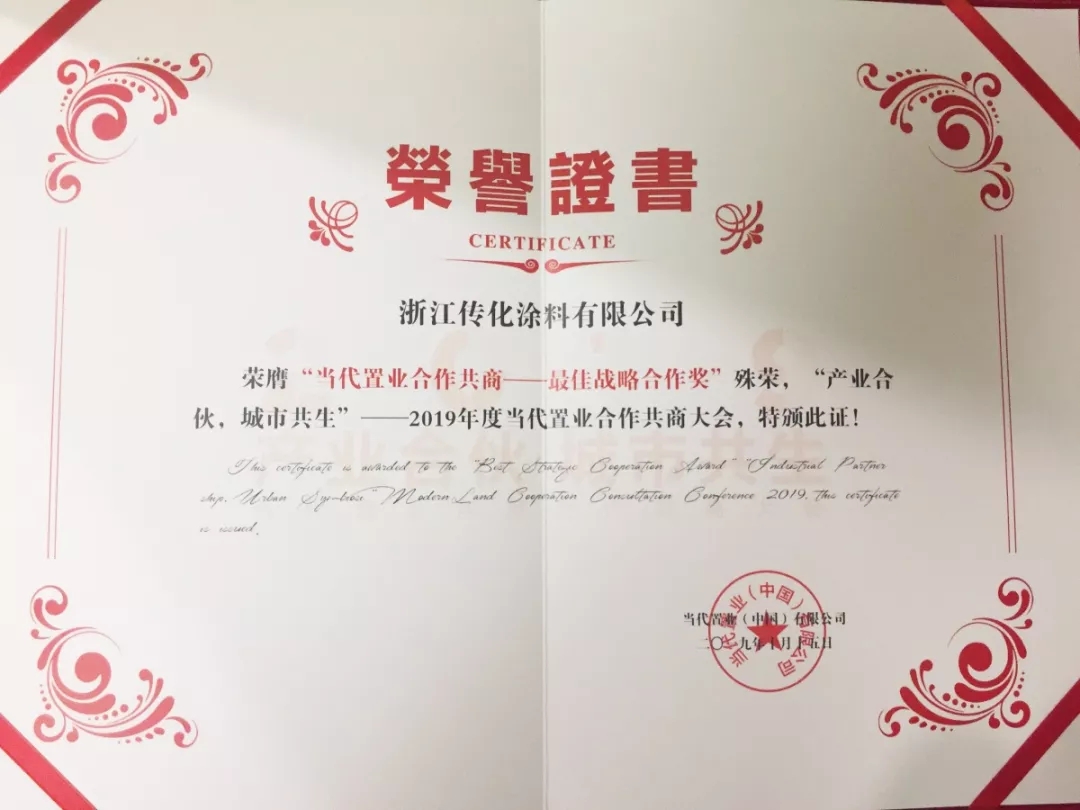 会上,当代置业向优秀的合作伙伴颁发了年度大奖。传化涂料凭借优质的产品、卓越的战略服务、雄厚的品牌实力在本次大会上被授予了“当代置业合作共商——最佳战略合作奖”称号!