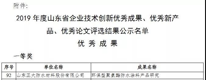 山东正大防水材料股份有限公司-环保型聚氨酯防水涂料产品研究荣获优秀成果一等奖。