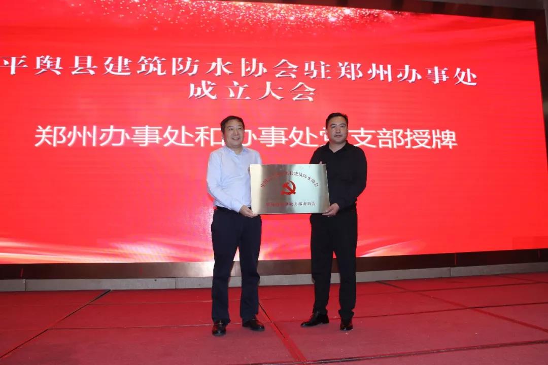 平舆县人民政府班子成员、县建筑防水协会党委书记、会长郑进中同志宣读关于成立平舆县建筑防水协会驻郑州办事处和办事处党支部的批复文件。