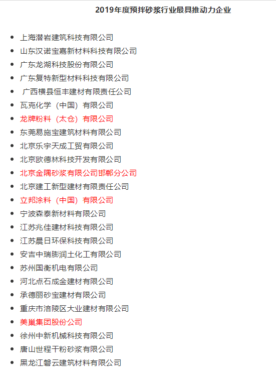 德高、美巢、立邦等获2019年度预拌砂浆行业最具影响力品牌;立邦、美巢等企业获2019年度预拌砂浆行业优秀企业;立邦、美巢等获2019年度预拌砂浆行业最具推动力企业;德高张泳东、美巢集团张经甫等获2019年度预拌砂浆行业领军人物;美巢集团研发总监李永鑫、立邦技术总监吴永文、德高研发总监董峰亮等2019预拌砂浆行业突出贡献青年专家;东方雨虹刘阳、齐俊岩、杨维、李明烨、张建兵,西卡刘莎娜,美巢李坤明、派丽方晓华、邹灵、尤俊平,立邦郑彦龙等入选2019预拌砂浆行业首届预拌砂浆行业检测能力大比武“优秀实验能手”。